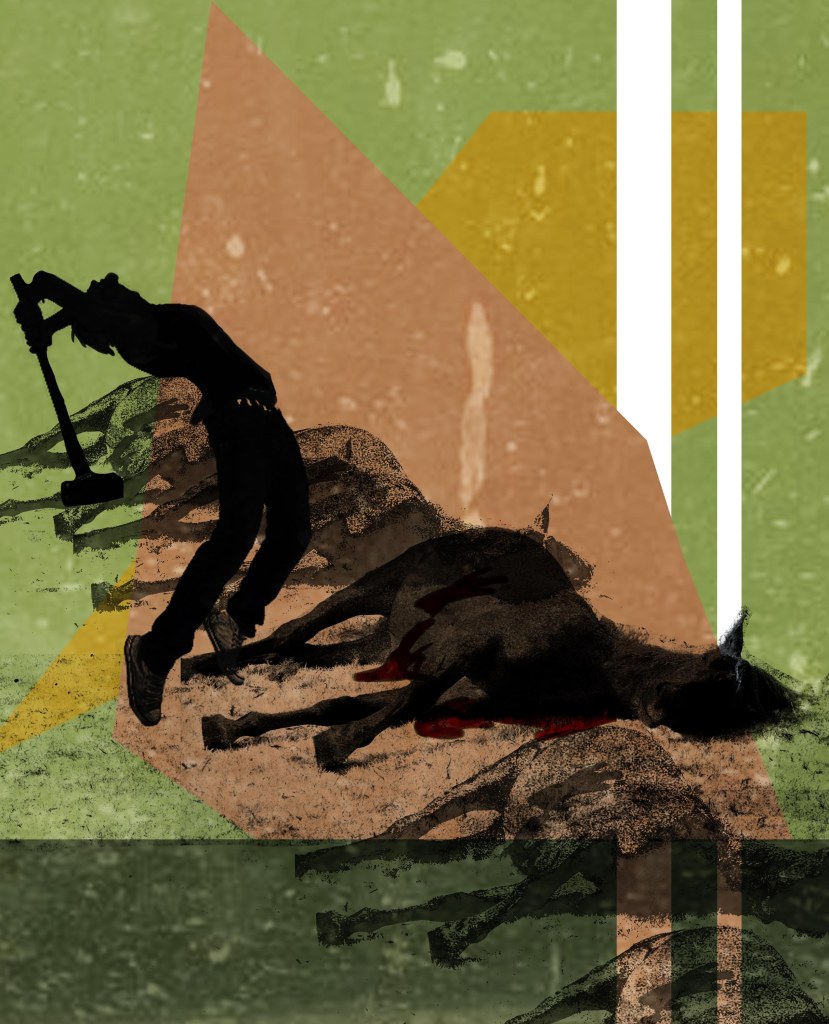 To our right, we heard the clap of hooves like the brr-app of an old Thompson machine gun, and when I looked over I saw two men racing, pushing their horses, slapping, hitting, kicking, willing the animals to go faster. As they approached that night’s agreed upon finish line, the streetlight to our left, the men racing in the darkness reappeared. The man going left pulled back on his reigns and the horse’s shoes skidded and sparked on the road. The horse turned it’s head at the last second, and then the two horses collided at what must have been a combined speed of eighty or ninety miles-per-hour. Their heavy, muscled bodies collided and then flailed into the night and onto the asphalt with a dense thud that made me think of what it looks like when two children are on a playground running around and aren’t paying attention to where they’re going, and then they run face first into one other. Smack, but with more weight.